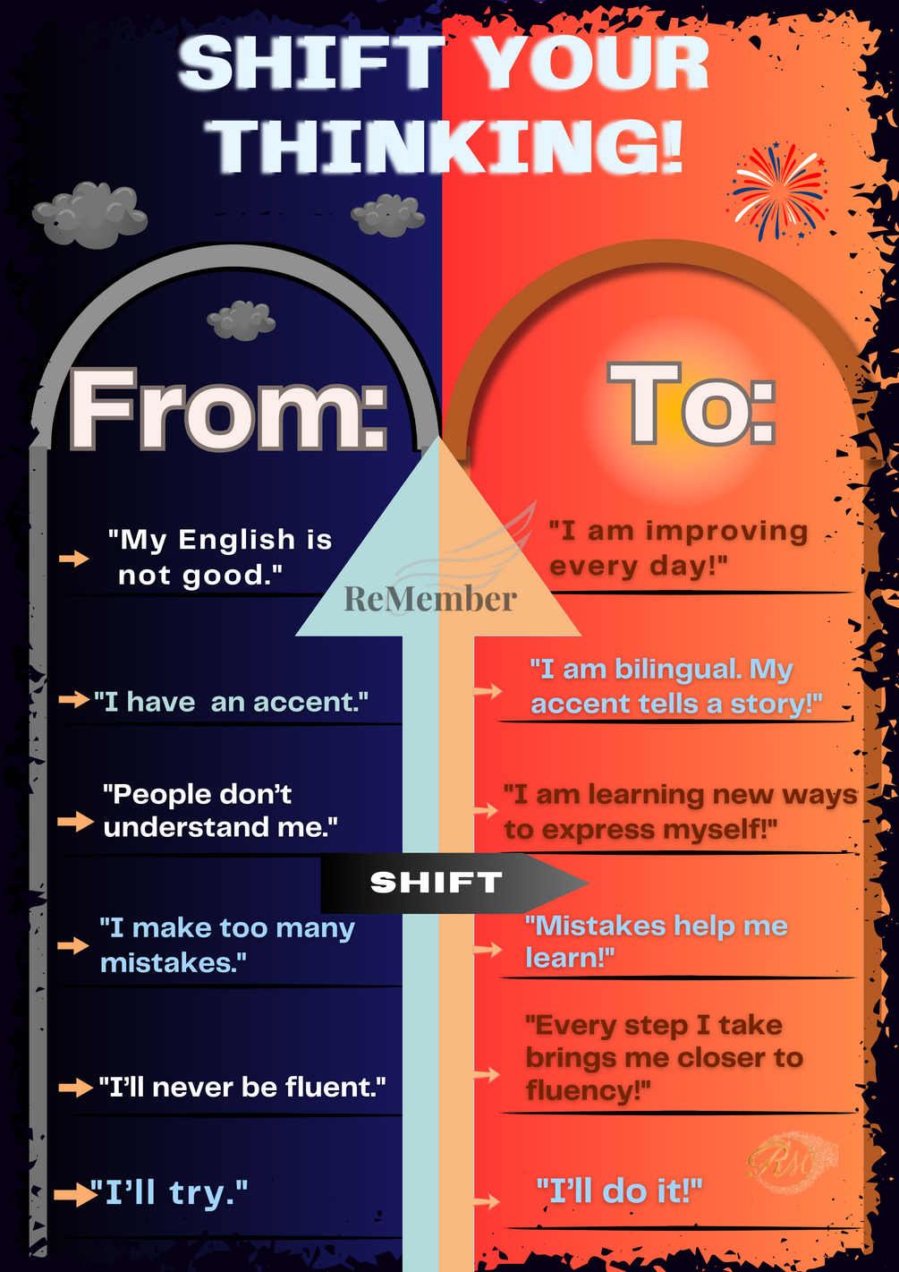 Learning English isn’t just about words—it’s about perspective! This motivational ESL poster helps learners reframe self-doubt into confidence by turning negative thoughts into positive, empowering affirmations.